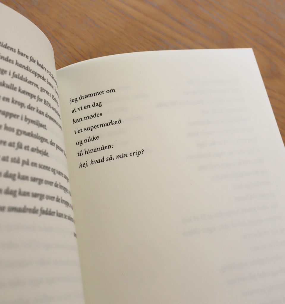 Crip er en bog om at være handicappet i Danmark i dag. Om systemer, der svigter. Om hvorfor det er lettere at tale om aktiv dødshjælp end livshjælp. Om mødre, der råber uden at få svar. Men det er også en bog, der insisterer på håb, handling og på nye måder at tale om anderledes kroppe.